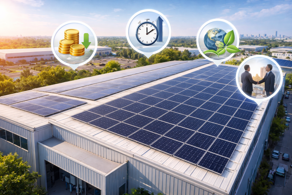 Buildings equipped with solar energy systems are often viewed as modern, efficient, and forward-thinking. This can increase property value and enhance your company’s reputation, especially in industries that prioritize sustainability and ESG (Environmental, Social, and Governance) standards.
